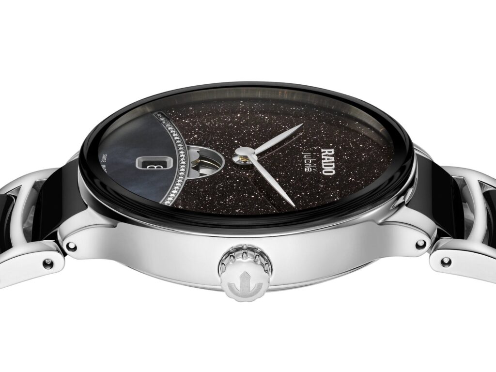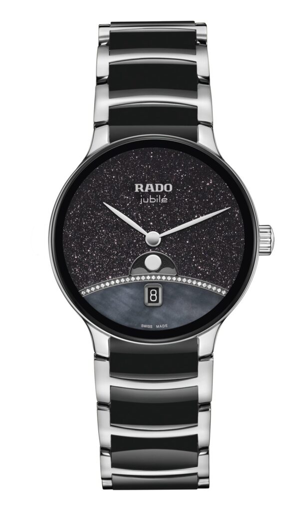 อีกส่วนหนึ่งของหน้าปัดรังสรรค์จากหินอะเวนทูรีน ซึ่งให้ประกายระยิบระยับราวกับหมู่ดาวที่กระจายอยู่ทั่วกาแล็กซี เหนือเส้นขอบฟ้า คือฟังก์ชันแสดงข้างขึ้นข้างแรม ซึ่งถือเป็นครั้งแรกที่ Rado นำฟังก์ชันนี้มาใช้กับคอลเลกชัน Centrix โดยดวงจันทร์ได้รับการรังสรรค์ด้วยโรเดียม เพื่อให้กลมกลืนกับเข็มชั่วโมงและเข็มนาที ถ่ายทอดวัฏจักรของดวงจันทร์อย่างงดงาม ตั้งแต่ข้างขึ้นจนถึงข้างแรมในแต่ละเดือน สะท้อนความลุ่มลึกและ แรงบันดาลใจจากเรื่องเล่าแห่งพันหนึ่งราตรี