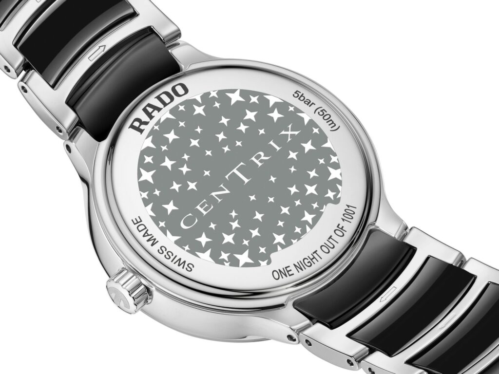 ด้านหลังตัวเรือนตกแต่งด้วยลวดลายดวงดาวที่สลักด้วยเลเซอร์ พร้อมข้อความ “LIMITED EDITION, ONE NIGHT OUT OF 1001” สะท้อนแรงบันดาลใจจากเรื่องราวแห่งพันหนึ่งราตรี