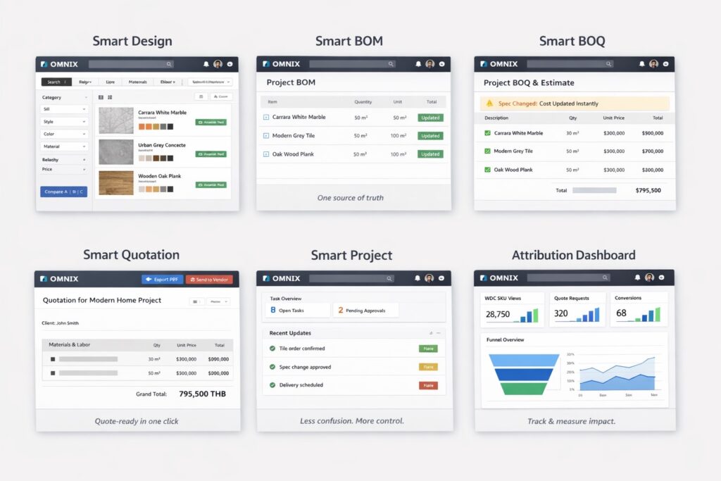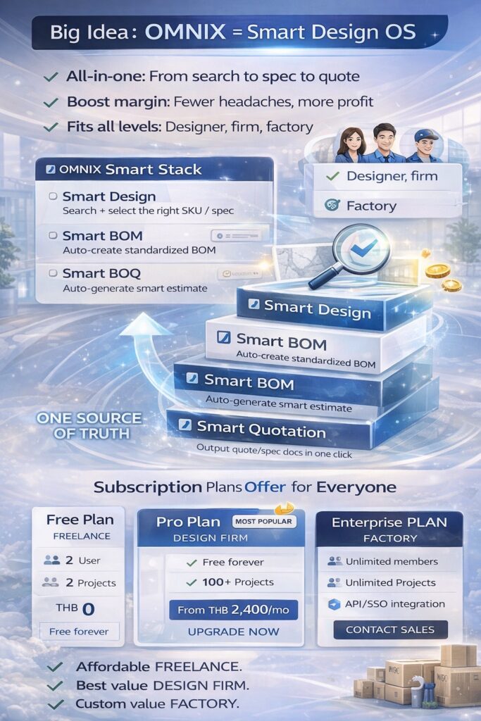 คุณภคภพ ช. เจริญยิ่ง | Founder / CEO, OMNIX กล่าวถึงที่มาและความตั้งใจในการพัฒนา OMNIX ว่า “OMNIX เกิดจากโจทย์จริงของงานตกแต่งภายในที่ผมเจอมาโดยตรงจากประสบการณ์ทำงานกว่า 30 ปี เราตั้งใจพัฒนาให้ OMNIX เป็น ‘หัวใจหลัก’ ของการทำงานออกแบบภายใต้แนวคิด SMART INTERIOR ECOSYSTEM ไม่ใช่แค่เครื่องมือช่วยออกแบบ แต่เป็นหัวใจของงานตกแต่งภายในทั้งระบบ ที่จะช่วยแก้ปัญหาได้รวดเร็ว ปิดงานได้เร็ว ทำงานได้มากขึ้น และลดความผิดพลาดที่เกิดซ้ำ ๆ ในโปรเจกต์”